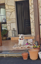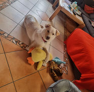 Seine Hinterläufe sind gerade noch verletzt als Folgen des Unfalls, daher trägt er draußen Schuhe. Dies heilt gerade. Er geht zweimal wöchentlich zum Tierarzt zur Wundkontrolle, dies wird auf Dauer nicht mehr nötig sein.